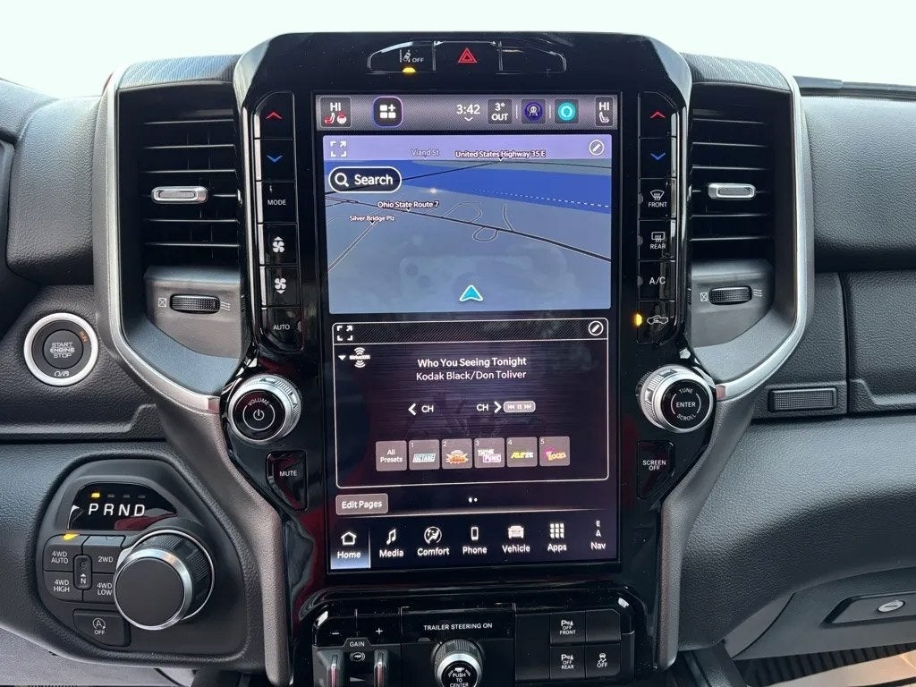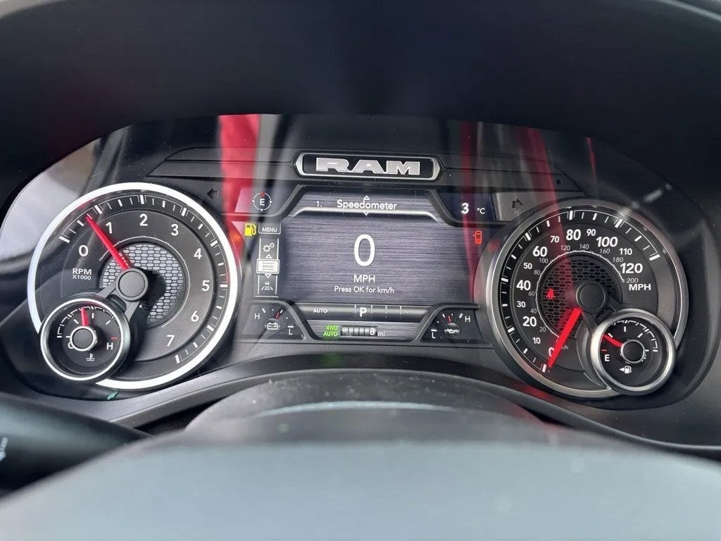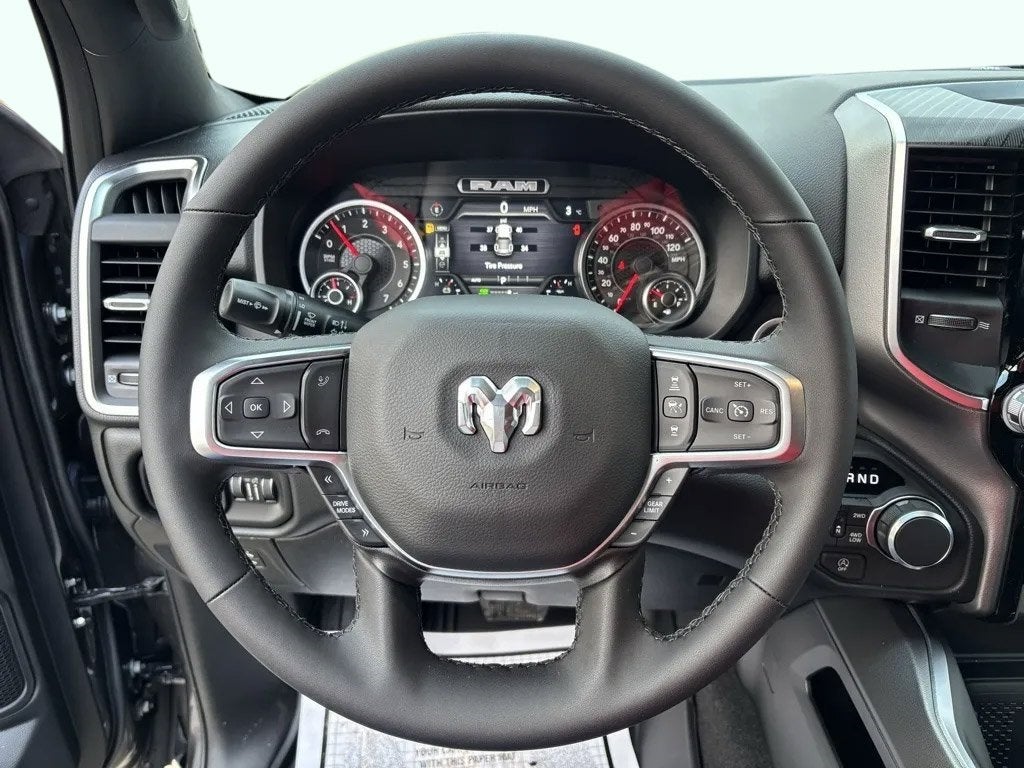 This Ram 1500 has many features and is well equipped including, 115V Auxiliary Power Outlet, 115V Auxiliary Rear Power Outlet, 12 Touchscreen Display, 3 Rear Seat Head Restraints, 4 Way Front Headrests, 4-Wheel Disc Brakes, 400W Inverter, 48V Belt Starter Generator, 4G LTE Wi-Fi Hot Spot, 6 Speakers, ABS brakes, Accent Color Tailgate Handle, Air Conditioning, Alloy wheels, AM/FM radio, Apple CarPlay, Apple CarPlay/Android Auto, Auto High-beam Headlights, Auto Power-Folding Mirrors, Auto-Dimming Exterior Driver Mirror, Auto-Dimming Rear-View Mirror, Big Horn Level 2 Equipment Group, Black Exterior Mirrors, Black Premium Power Mirrors, Body Color Fender Flares, Brake assist, Bucket Seats, Bumpers: chrome, Center Console Parts Module, Cloth Bucket Seats, Cluster 7.0 TFT Color Display, Compass, Configurable Drive Mode, Connectivity - US/Canada, Convex Wide-Angle Exterior Mirror Insert, Delay-off headlights, Deluxe Cloth Bucket Seats, Disassociated Touchscreen Display, Driver door bin, Dual front impact airbags, Dual front side impact airbags, Electronic Stability Control, Exterior Mirrors Courtesy Lamps, Front anti-roll bar, Front Bucket Seats, Front Center Armrest w/Storage, Front fog lights, Front License Plate Bracket, Front reading lights, Front Seat Back Map Pockets, Front wheel independent suspension, Full Length Floor Console, Fully automatic headlights, Glove Box Lamp, Google Android Auto, GPS Antenna Input, GPS Navigation, HD Radio, Heated door mirrors, Heated Front Seats, Heated Steering Wheel, Illuminated entry, Integrated Center Stack Radio, Leather Wrapped Steering Wheel, LED Footwell Lighting, Low tire pressure warning, Manual Adjust 4-Way Driver Seat, Manual Adjust 4-Way Front Passenger Seat, Manual Folding Exterior Mirrors, Manufacturer's Statement of Origin, MyFlexCare Service Plan, Occupant sensing airbag, Outside temperature display, Overhead airbag, Overhead console, Overhead LED Lamps, Panic alarm, ParkView Rear Back-Up Camera, Passenger door bin, Passenger vanity mirror, Power 2-Way Driver Lumbar Adjust, Power Adjust 8-Way Driver Seat, Power Adjustable Pedals, Power door mirrors, Power steering, Power windows, Premium Overhead Console, Quick Order Package 27Z Big Horn, Radio data system, RAM Grille Badge - Chrome, Rear 60/40 Folding Seat, Rear anti-roll bar, Rear Center Armrest, Rear Power Sliding Window, Rear step bumper, Rear Window Defroster, Remote keyless entry, Remote Tailgate Release, Security Alarm, SiriusXM Radio Service, Speed control, Steering Wheel Mounted Audio Controls, Supplier Part Tracking (J-1), Tachometer, Telescoping steering wheel, Tilt steering wheel, Traction control, Trailer Brake Control, Trailer Reverse Steering Control, Trailer Tire Pressure Monitoring System, Trailer Tow Group II, Trip computer, Universal Garage Door Opener, USB Host Flip, Variably intermittent wipers, Voltmeter, Wheels: 18 x 8 Cast-Aluminum Painted, Wheels: 20 x 9 Aluminum Chrome Clad.