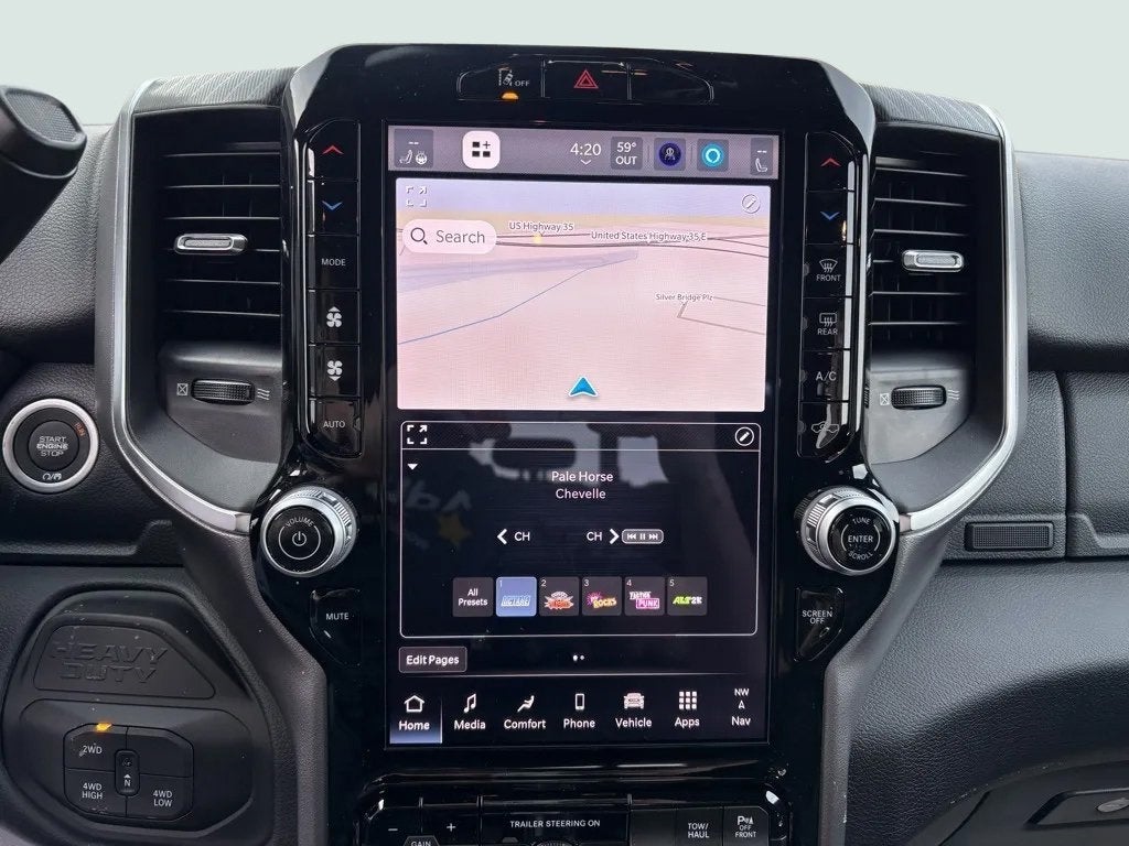 This Ram 3500 has many features and is well equipped including, 115-Volt Auxiliary Front Power Outlet, 2nd Row in Floor Storage Bins, 4-Wheel Disc Brakes, 40/20/40 Split Bench Seat, 400W Inverter, 5th Wheel/Gooseneck Towing Prep Group, 6 Speakers, 9 Alpine Speakers with Subwoofer, ABS brakes, Active Lane Management System, Air Conditioning, AM/FM radio: SiriusXM, Apple CarPlay, Auto Power-Folding Mirrors, Auto-Dimming Rear-View Mirror, Big Horn Level 2 Plus Equipment Group, Black Exterior Truck Badging, Black Interior Accents, Blind Spot and Cross Path Detection, Brake assist, Bumpers: chrome, Center Stop Lamp with Cargo View Camera, Cold Weather Group, Compass, Connectivity - US/Canada, Dampened Tailgate, Digital 3.0 Rear View Auto Dimming Mirror, Disassociated Touchscreen Display, Drowsy Driver Detection, Dual front impact airbags, Dual Glove Boxes, Electronic Stability Control, Emergency Vehicle Alert System (EVAS), Engine Block Heater, Exterior 115V AC Outlet, Exterior Mirrors Courtesy Lamps, Exterior Mirrors with Heating Element, Exterior Mirrors with Supplemental Signals, Foam Bottle Insert (door Trim Panel), Footwell Courtesy Lamp, For More Info, Call 800-643-2112, Forward and Reverse Utility Lights, Front anti-roll bar, Front Center Armrest w/Storage, Front fog lights, Front License Plate Bracket, Front reading lights, Gloss Black Nostrils/Molded in Color Black Grille, Glove Box Lamp, Google Android Auto, GPS Antenna Input, GPS Navigation, Heated door mirrors, Heated Steering Wheel, Integrated Voice Command with Bluetooth®, LED Bed Lighting, LED Tail Lamps, Luxury Steering Wheel, Manufacturer's Statement of Origin, Mirror Running Lights, MOPAR Deployable Bed Step, MOPAR Spray in Bedliner, MOPAR Winter Front Grille Cover, MyFlexCare Service Diesel, Night Edition, Occupant sensing airbag, Outside temperature display, Overhead console, Painted Front Bumper, Panic alarm, ParkView Rear Back-Up Camera, Passenger door bin, Power Adjust Mirrors, Power Adjustable Pedals, Power door mirrors, Power Heated Fold Telescopic Mirrors, Power steering, Power Telescoping Mirrors, Power-Adjustable Convex Aux Mirrors, Quick Order Package 24Z Big Horn, Radio data system, Radio: Uconnect 5 with 8.4 Display, Rain Sensitive Windshield Wipers, Rear Folding Seat, Rear seat center armrest, Rear step bumper, Red Tail Lamp Bezels, Remote keyless entry, Remote Start System, Remote USB Port - Charge Only, SiriusXM with 360L, Speed control, Storage Tray, Sun Visors with Illuminated Vanity Mirrors, Tachometer, Tow Technology Plus Group, Traction control, Traffic Sign Recognition, Trailer Reverse Guidance, Trailer Tire Pressure Monitoring System, Trip computer, Turn signal indicator mirrors, Universal Garage Door Opener, Variably intermittent wipers, Voltmeter.
