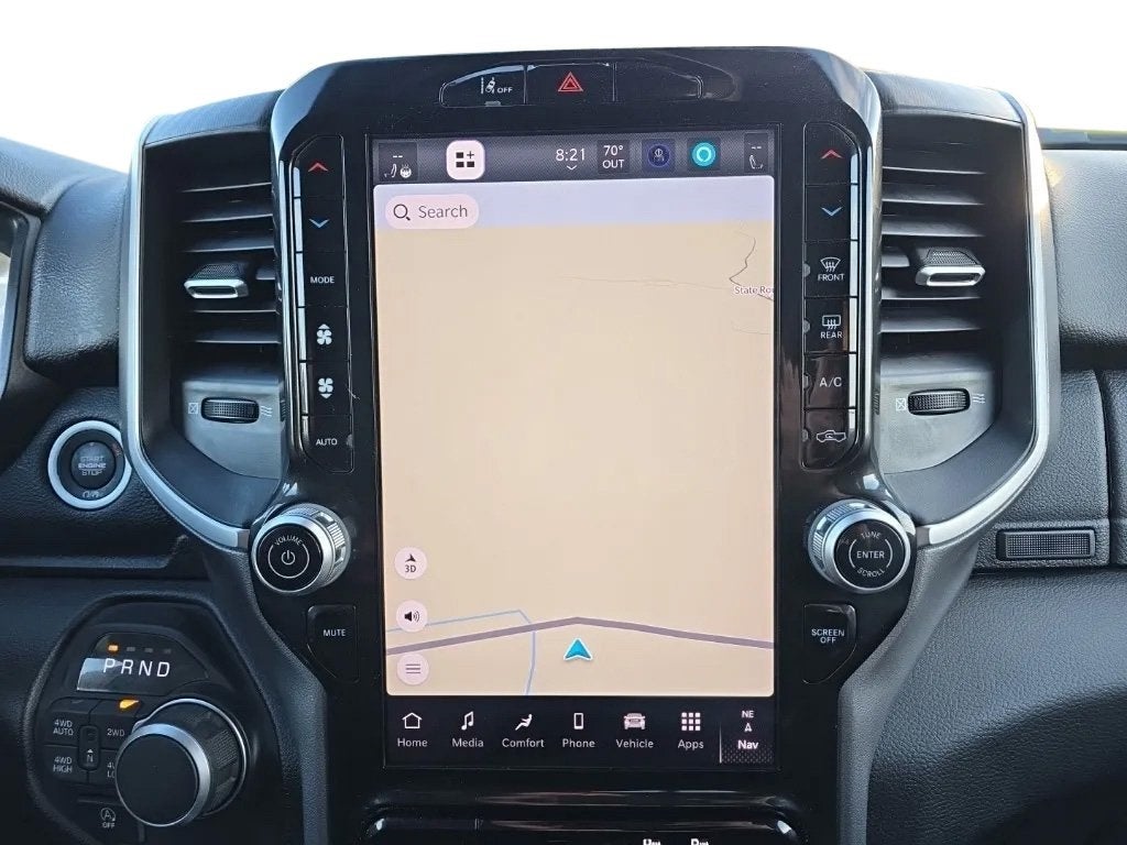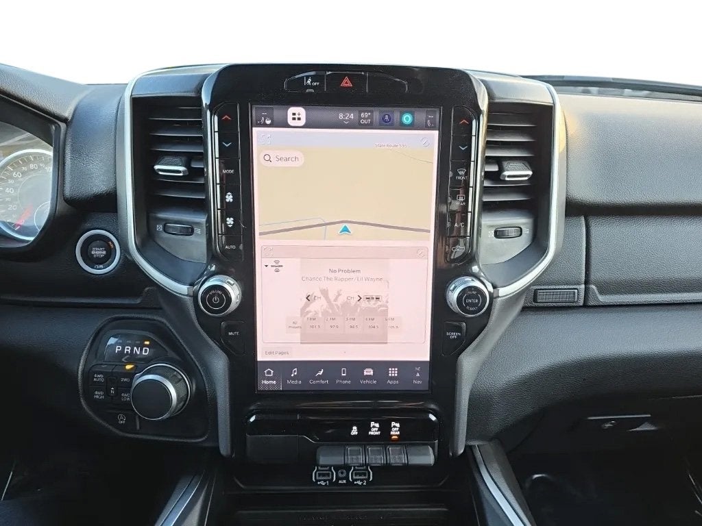 This Ram 1500 has many features and is well equipped including, 115V Auxiliary Power Outlet, 115V Auxiliary Rear Power Outlet, 12 Touchscreen Display, 2nd Row In Floor Storage Bins, 3 Rear Seat Head Restraints, 4 Way Front Headrests, 4-Wheel Disc Brakes, 400W Inverter, 4G LTE Wi-Fi Hot Spot, 6 Speakers, 9 Amplified Speakers w/Subwoofer, ABS brakes, Air Conditioning, Air Conditioning ATC w/Dual Zone Control, Alloy wheels, AM/FM radio, Apple CarPlay, Apple CarPlay/Android Auto, Auto High-beam Headlights, Auto Power-Folding Mirrors, Auto-Dimming Exterior Driver Mirror, Auto-Dimming Rear-View Mirror, Big Horn Level 2 Equipment Group, Black Exterior Mirrors, Black Premium Power Mirrors, Brake assist, Bumpers: chrome, Cloth Bench Seat, Cluster 7.0 TFT Color Display, Compass, Configurable Drive Mode, Connected Travel & Traffic Services, Connectivity - US/Canada, Convex Wide-Angle Exterior Mirror Insert, Delay-off headlights, Driver door bin, Dual front impact airbags, Dual front side impact airbags, Electronic Stability Control, Exterior Mirrors Courtesy Lamps, Exterior Mirrors w/Heating Element, Exterior Mirrors w/Supplemental Signals, Front anti-roll bar, Front Center Armrest w/Storage, Front fog lights, Front License Plate Bracket, Front reading lights, Front Seat Back Map Pockets, Front wheel independent suspension, Fully automatic headlights, Glove Box Lamp, Google Android Auto, GPS Antenna Input, GPS Navigation, HD Radio, Heated door mirrors, Heated Front Seats, Heated Steering Wheel, Illuminated entry, Integrated Voice Command w/Bluetooth®, Leather Wrapped Steering Wheel, LED Dome Lamp w/On/Off Switch, LED Footwell Lighting, Low tire pressure warning, Manual Adjust 4-Way Front Passenger Seat, Manual Folding Exterior Mirrors, Manufacturer's Statement of Origin, Media Hub w/2 Charge Only USBs, Occupant sensing airbag, Outside temperature display, Overhead airbag, Overhead console, Overhead LED Lamps, Panic alarm, ParkView Rear Back-Up Camera, Passenger door bin, Passenger vanity mirror, Power 2-Way Driver Lumbar Adjust, Power Adjust 8-Way Driver Seat, Power Adjustable Pedals, Power door mirrors, Power steering, Power windows, Premium Overhead Console, Quick Order Package 21Z Big Horn, Radio data system, Radio: Uconnect 5 Nav w/12.0 Display, Radio: Uconnect 5 W w/8.4 Display, RAM Grille Badge - Chrome, Rear 60/40 Folding Seat, Rear anti-roll bar, Rear Power Sliding Window, Rear seat center armrest, Rear step bumper, Rear Window Defroster, Remote keyless entry, Remote Tailgate Release, Security Alarm, SiriusXM w/360L, Speed control, Split folding rear seat, Steering Wheel Mounted Audio Controls, Sun Visors w/Illuminated Vanity Mirrors, Supplier Part Tracking (J-1), Tachometer, Telescoping steering wheel, Tilt steering wheel, Traction control, Trip computer, Universal Garage Door Opener, USB Host Flip, Variably intermittent wipers, Voltmeter, Wheels: 18 x 8 Cast-Aluminum Painted.